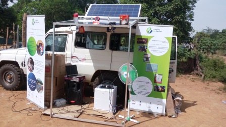 To showcase the potential of solar technology, GIZ/EnDev has equipped a car with solar panels, a projector, a popcorn machine and a freezer. During the day, the panels on the car provide energy for the freezer and the popcorn machine. At night, educational and entertaining movies can be shown while solar lamps on the car allow visitors to read the information displayed on the vehicle.