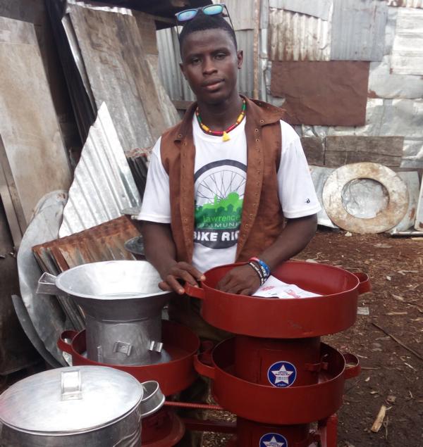 Joe Mulbah, RFP producer Joe Mulbah produces the improved cook stove called Red Fire Pot in a workshop on Bushrod island, battery factory area.