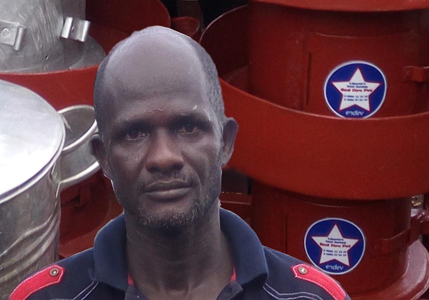 Mamadou Camara, Red Frire Pot producer Mamadou Camara produces the improved Red Fire Pots (RFP)s in his metal workshop on Bushrod island, battery factory.